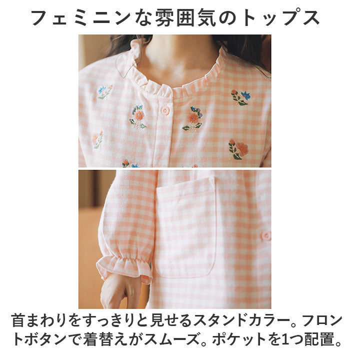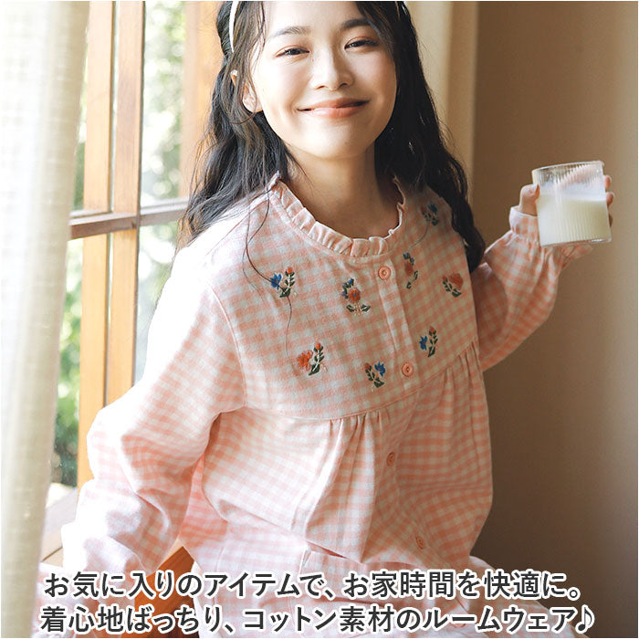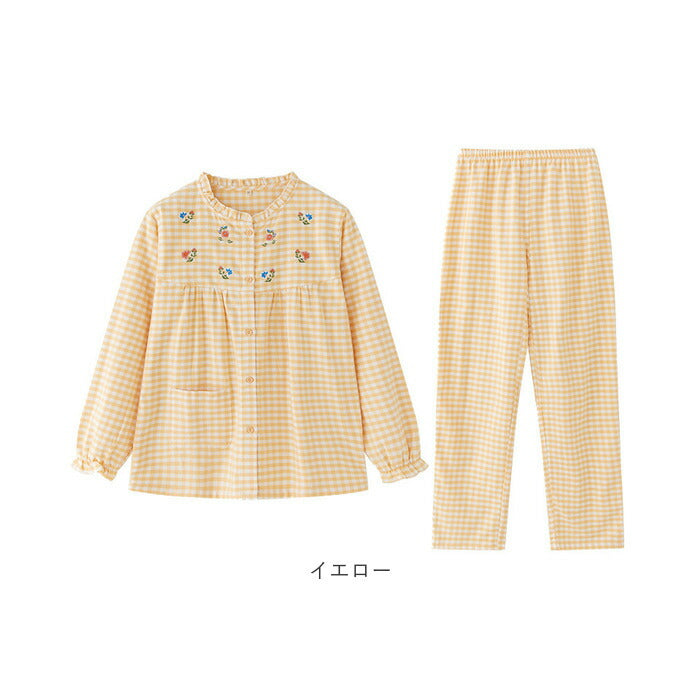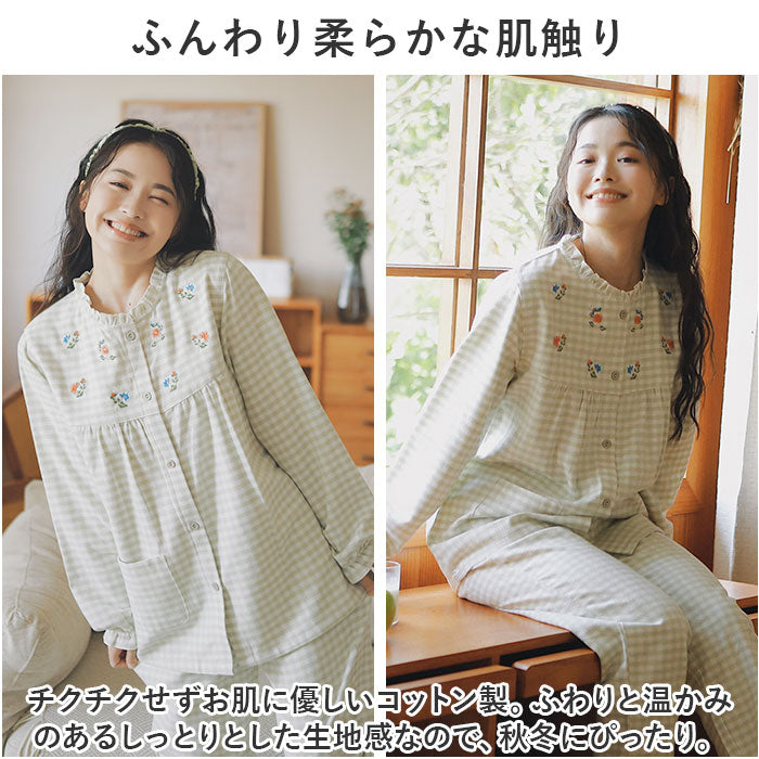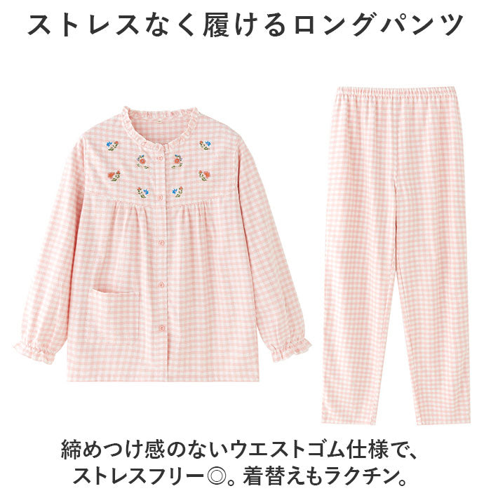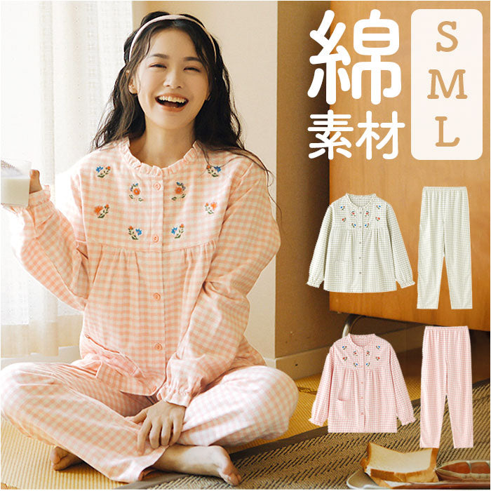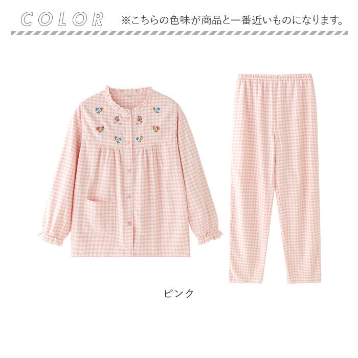 パジャマ レディース 長袖 通販 ルームウェア 寝巻き 寝間着 ナイトウェア 綿 コットン 前開き 秋 冬 長ズボン 上下セット チェック 刺繍 旅行 お泊り 入院 部屋着 室内着 かわいい