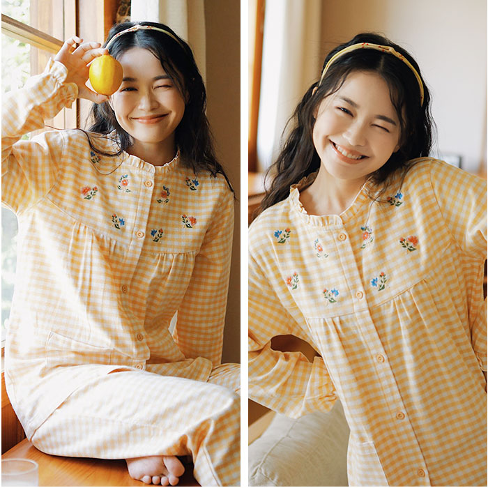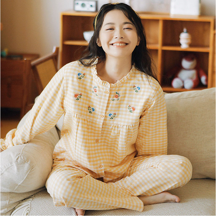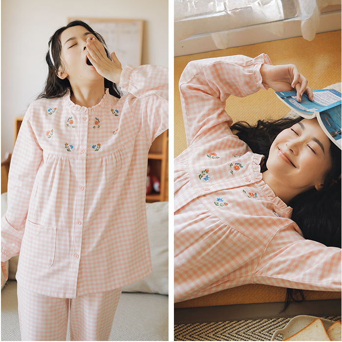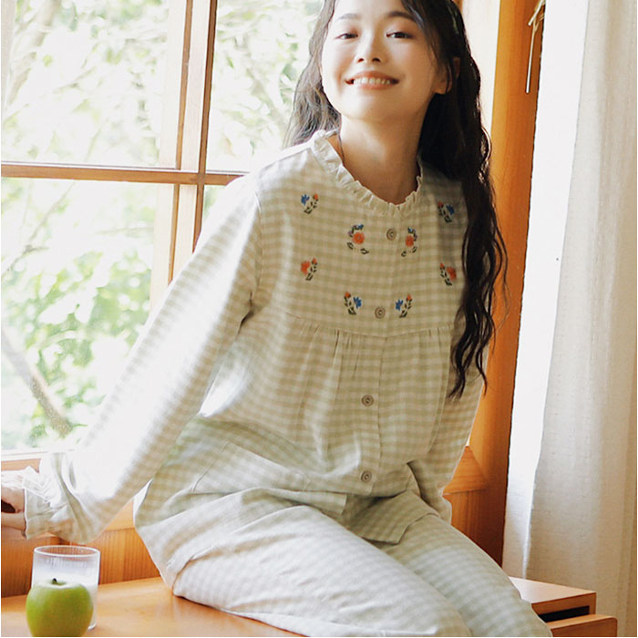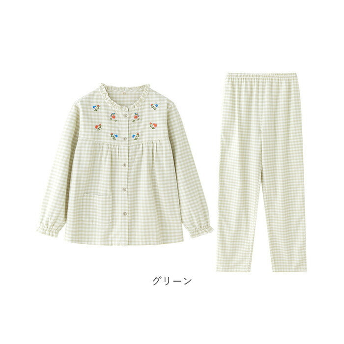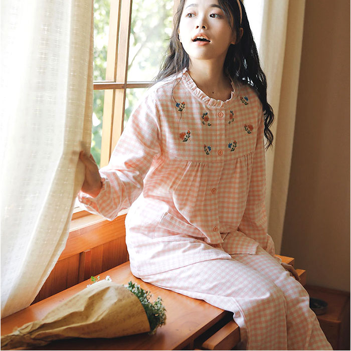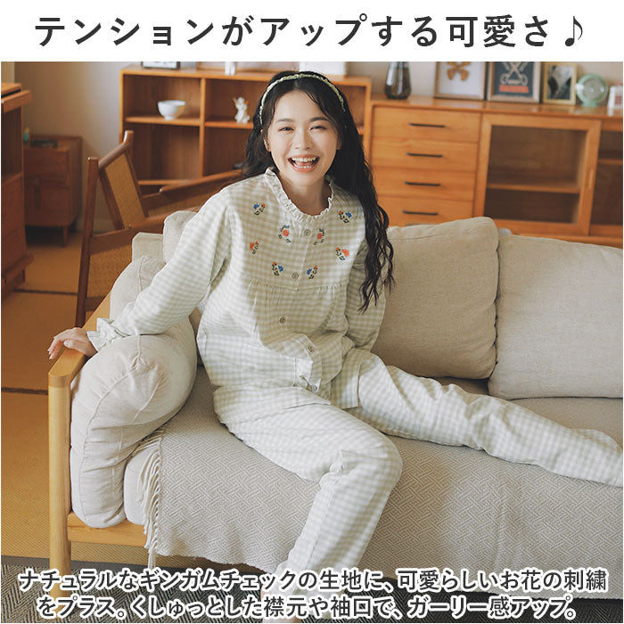 パジャマ レディース 長袖 通販 ルームウェア 寝巻き 寝間着 ナイトウェア 綿 コットン 前開き 秋 冬 長ズボン 上下セット チェック 刺繍 旅行 お泊り 入院 部屋着 室内着 かわいい