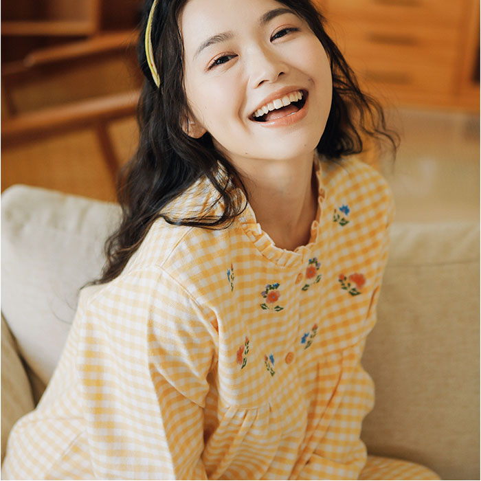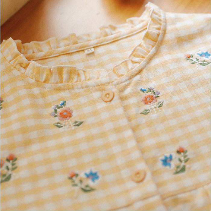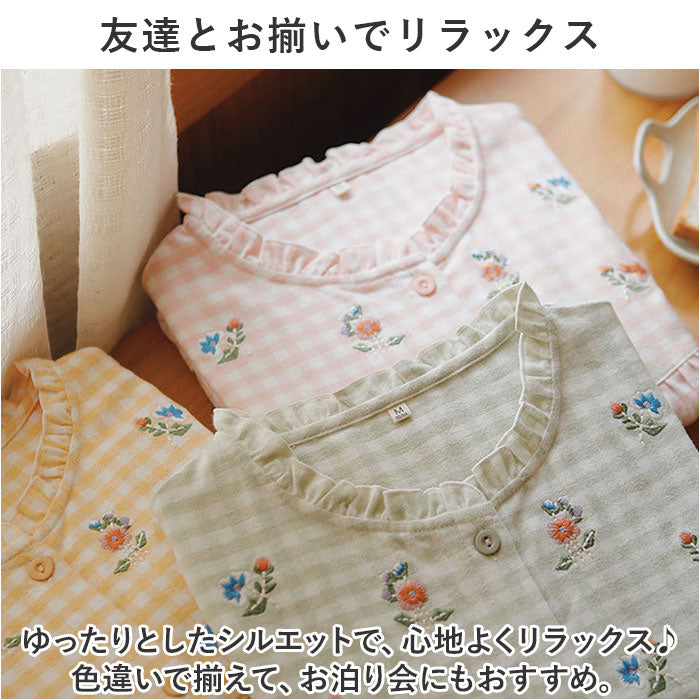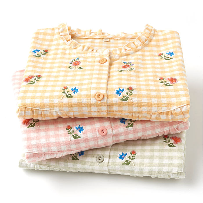 ・ナチュラルなギンガムチェックの生地に、可愛らしいお花の刺繍をプラス。くしゅっとした襟元や袖口で、ガーリー感アップ。