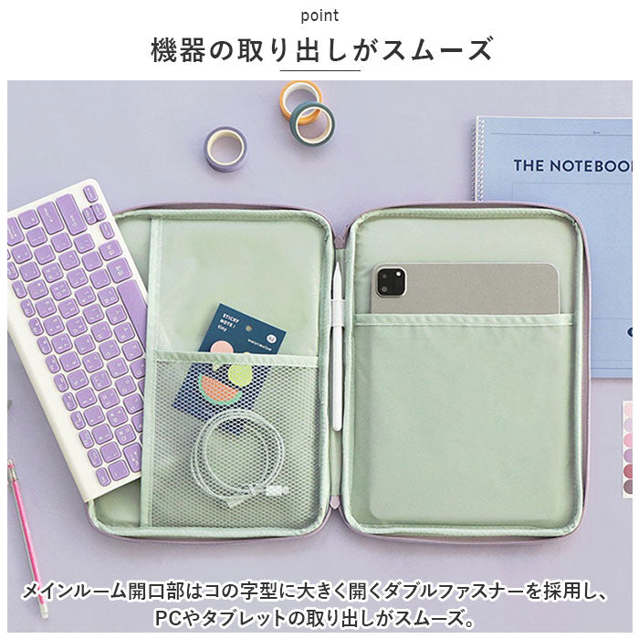 ※ファスナーを開いて右側のフラップにタブレット専用オープンポケット。左側のフラップには、薄型キーボードやノートが収納できるオープンポケット×1に、周辺機器が整理できるメッシュポケット×1付き。