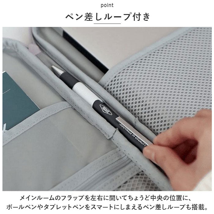・メインルームのフラップを左右に開いてちょうど中央の位置に、ボールペンやタブレットペンをスマートにしまえるペン差しループも搭載。