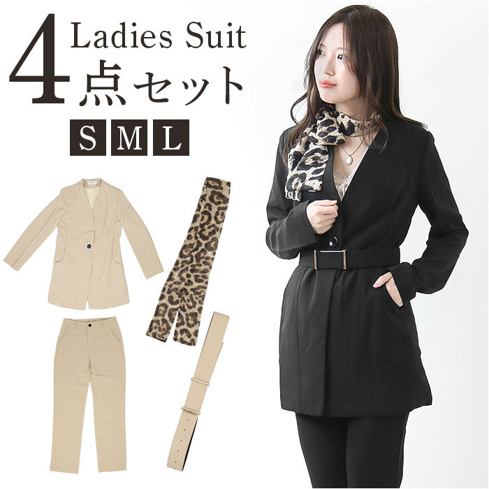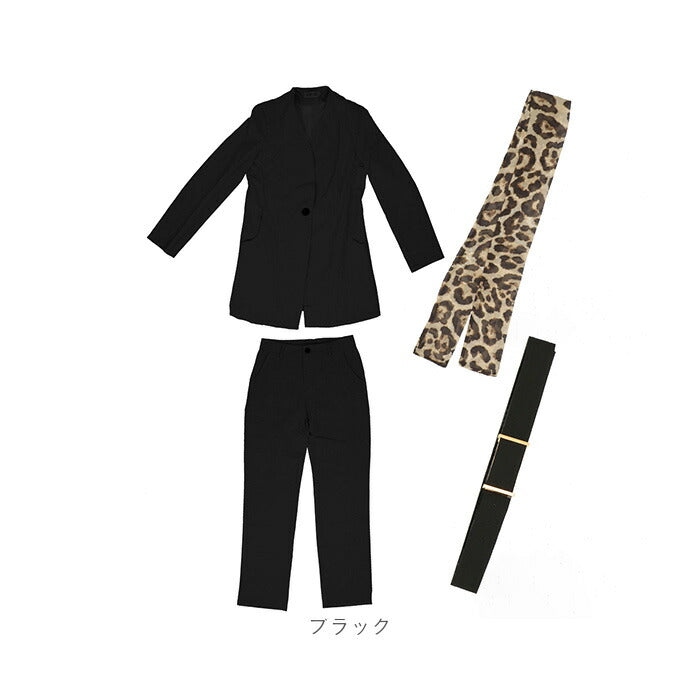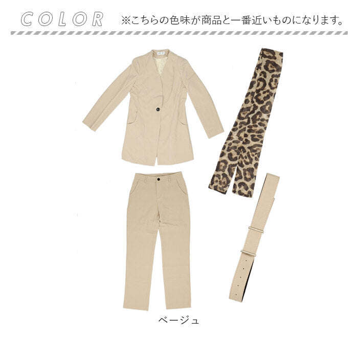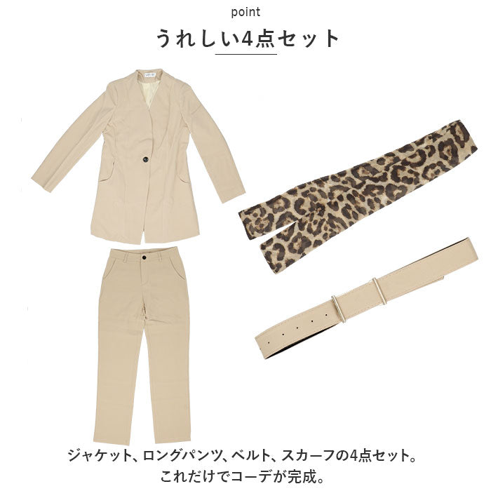 ・ジャケット、ロングパンツ、ベルト、スカーフの4点セット。これだけでコーデが完成。