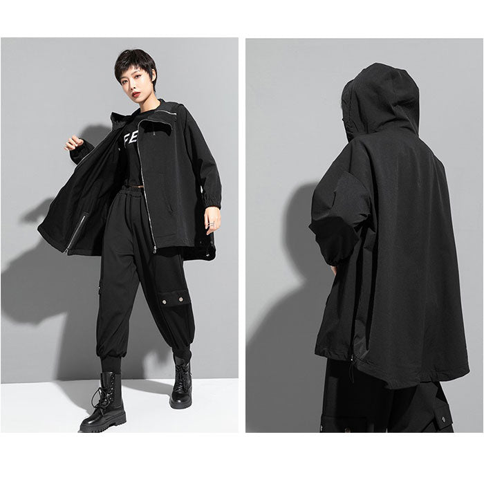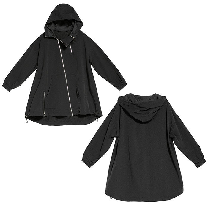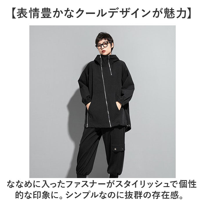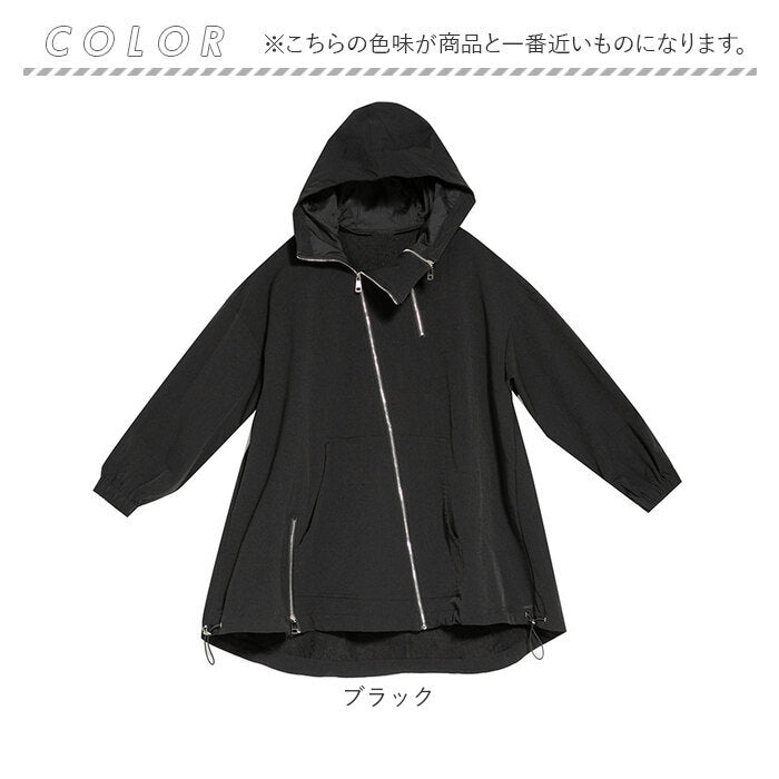パーカー ブルゾン レディース 通販 ジャケット 羽織り 羽織 ライトアウター 斜め ジップ 長袖 アシンメトリー スタンドカラー 立ち襟 衿 襟 伸縮性 無地 斜めジップ フード付き フード