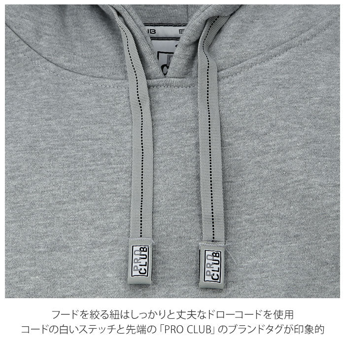 ・フードを絞る紐はしっかりと丈夫なドローコードを使用。コードの白いステッチと先端の「PRO CLUB」のブランドタグが印象的。