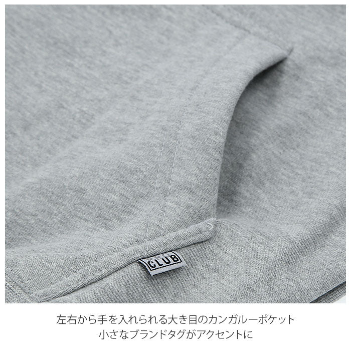 ・左右から手を入れられる大き目のカンガルーポケット。小さなブランドタグがアクセントに。