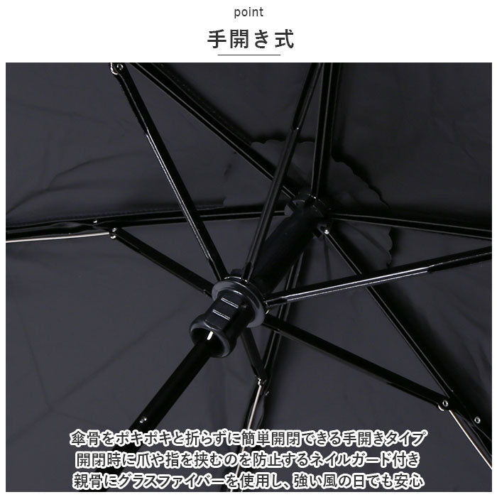 ・傘骨をポキポキと折らずに簡単開閉できる手開きタイプ。開閉時に爪や指を挟むのを防止するネイルガード付きで、ネイルアートを施した指でも安全に開閉できる。