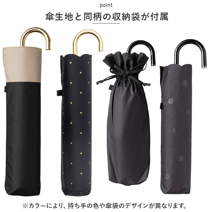 ・傘生地と同柄の収納袋が付属し、内側にはブラックコーティングが施されているのもポイント!(※カラーにより、持ち手の色や傘袋のデザインが異なります。)