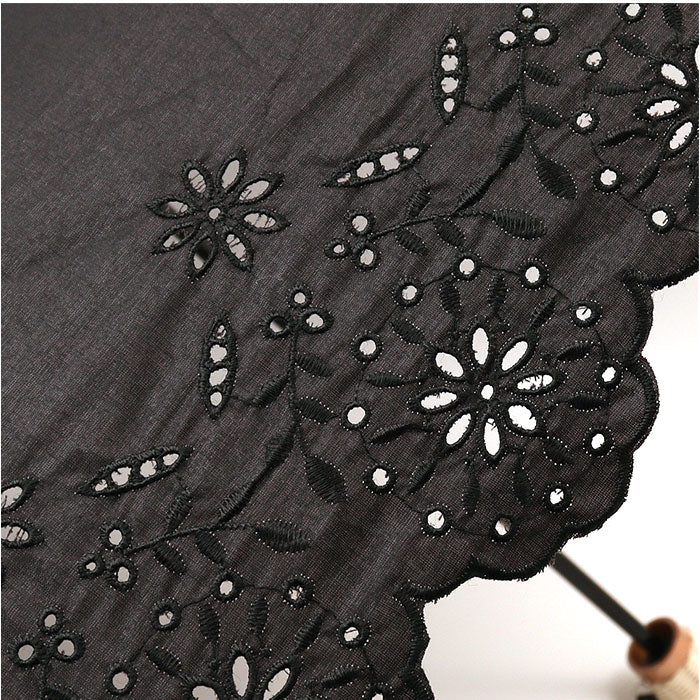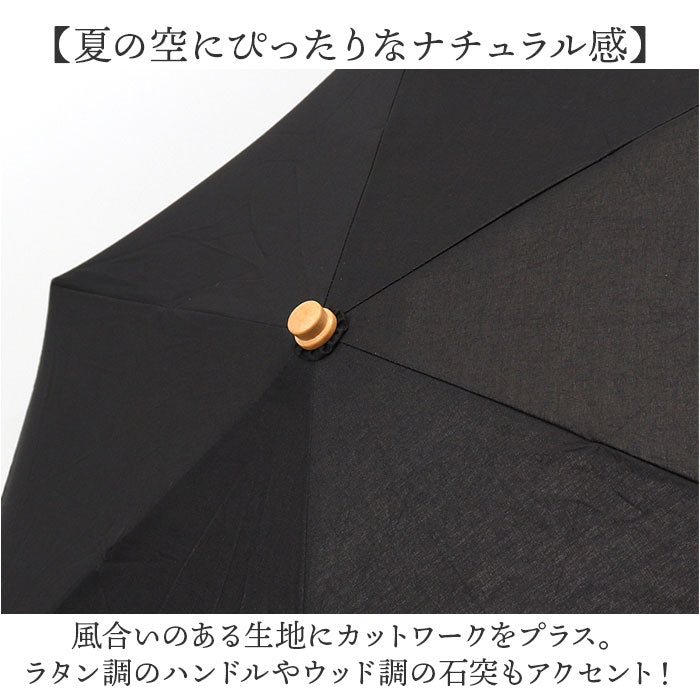 ・風合いのある生地にカットワークをプラス。ラタン調のハンドルやウッド調の石突もアクセント!