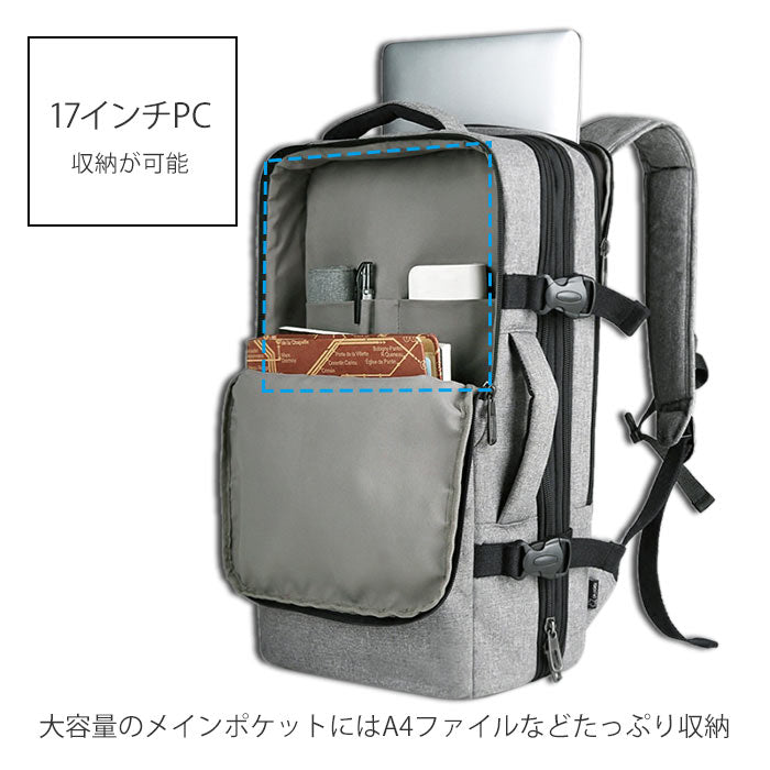 ・PC、スマホなどの専用収納ポケットの他に、1泊分の着替えが入るスペースがあり出張や旅行に最適。また、奥行拡張設計なので、荷物が増えてもスペースを広げることができる。