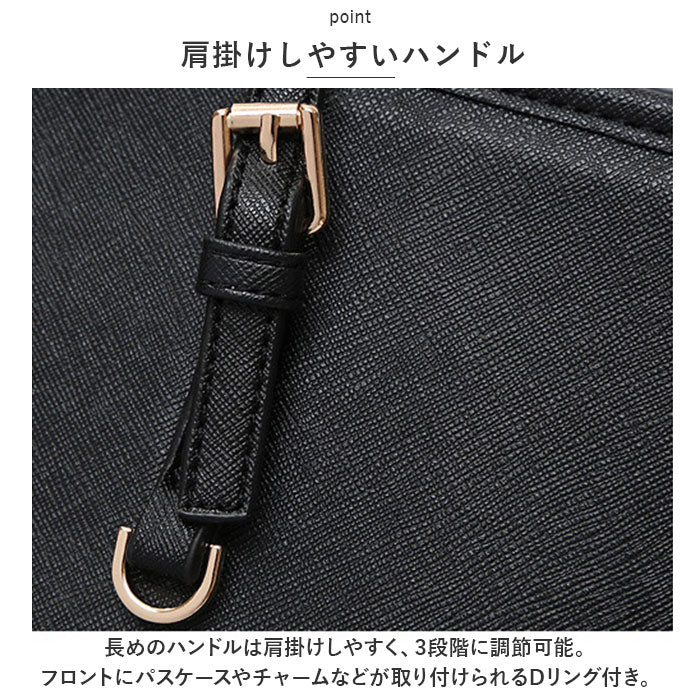 ・長めのハンドルは肩掛けしやすく、3段階に調節可能。フロントにパスケースやチャームなどが取り付けられるDリング付き。