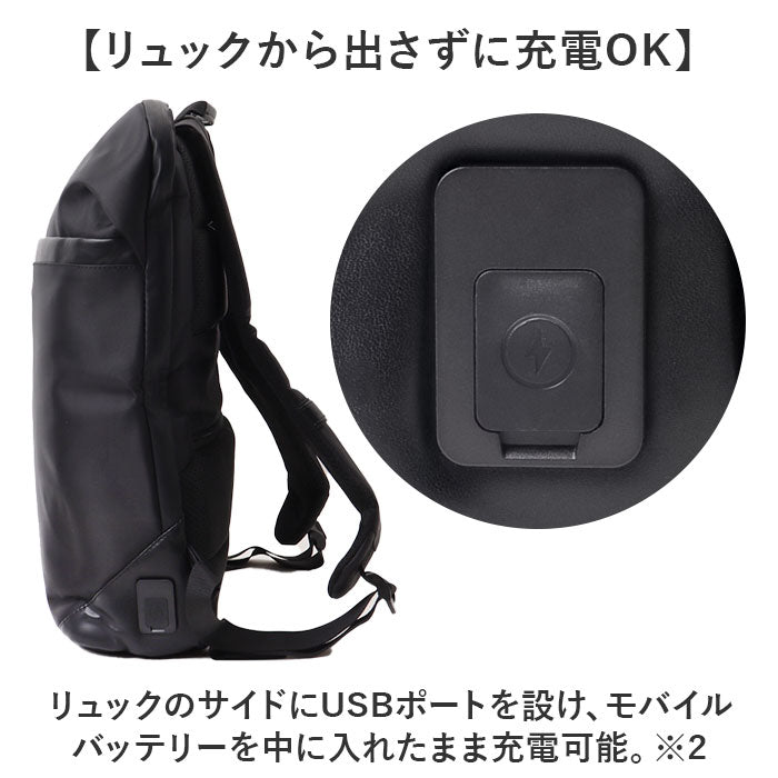 ・リュックのサイドにUSBポートを設け、モバイルバッテリーを中に入れたまま充電可能。※2