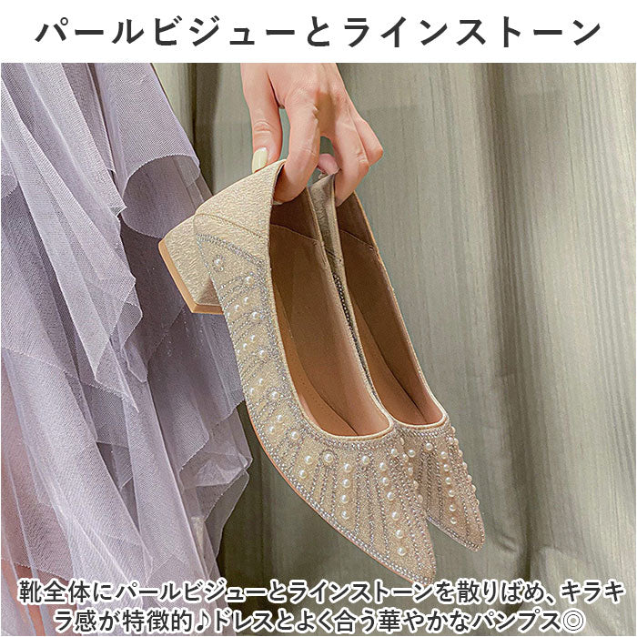 ・靴全体にパールビジューとラインストーンを散りばめ、キラキラ感が特徴的♪ドレスとよく合う華やかなパンプス◎