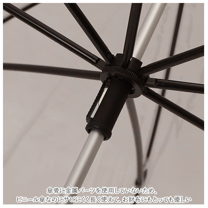 ・傘骨に金属パーツを使用していないため、ビニール傘なのにサビにくく長く使えて、お財布にもとっても優しい。