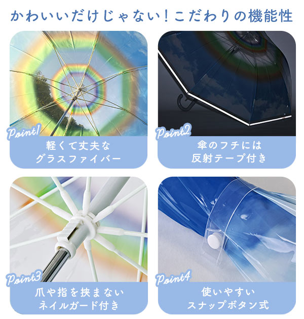 58.5cmの大判サイズで強い雨の日も濡れにくく安心です。爪や指をはさまないネイルガード付き!さらにビニール素材のポリエチレンは燃やしてもダイオキシンが発生しない環境に優しい素材です。