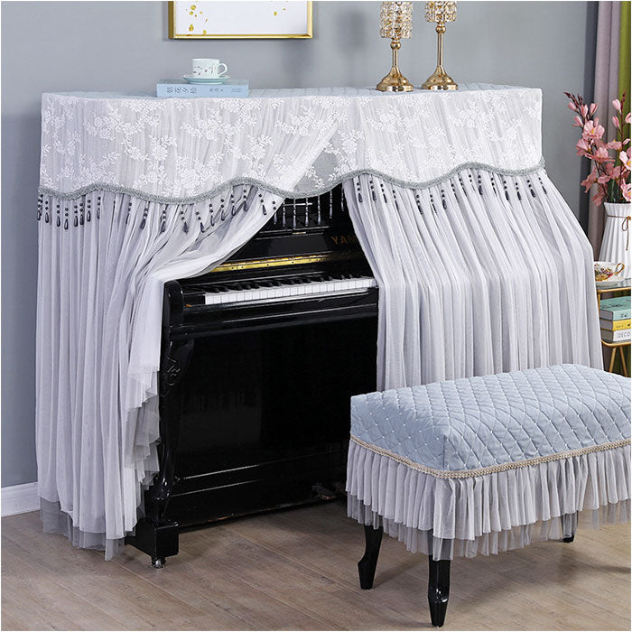 ・カバー正面は、薄手のドレープ生地に透け感のあるチュール生地を合わせた2重構造。中央のスリット部分を左右に開けば、カバーを外さずにピアノ演奏が可能。