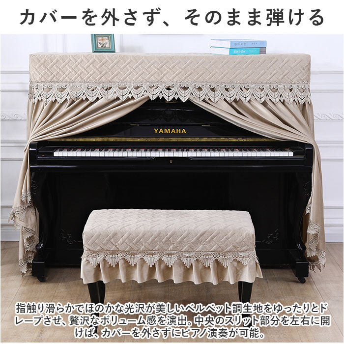 ・指触り滑らかでほのかな光沢が美しいベルベット調生地をゆったりとドレープさせ、贅沢なボリューム感を演出。中央のスリット部分を左右に開けば、カバーを外さずにピアノ演奏が可能。