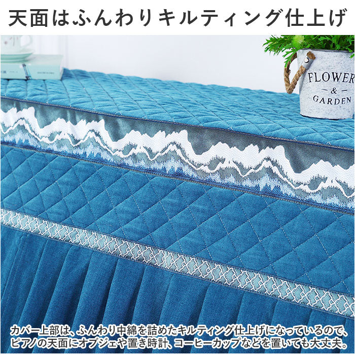 ・カバー上部は、ふんわり中綿を詰めたキルティング仕上げになっているので、ピアノの天面にオブジェや置き時計、コーヒーカップなどを置いても大丈夫。
