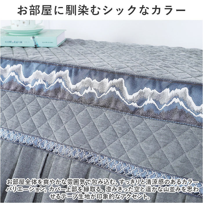 ・お部屋全体を爽やかな雰囲気で包み込む、すっきりと清涼感のあるカラーバリエーション。カバー上部を縁取る、澄みきった空と遥かな山並みを思わせるテープ生地が印象的なアクセント。