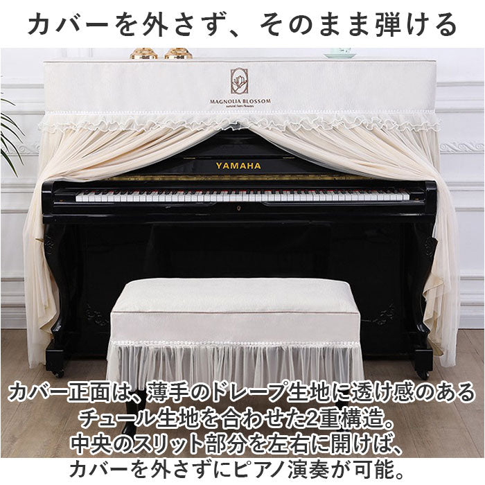 ・カバー正面は、薄手のドレープ生地に透け感のあるチュール生地を合わせた2重構造。中央のスリット部分を左右に開けば、カバーを外さずにピアノ演奏が可能。