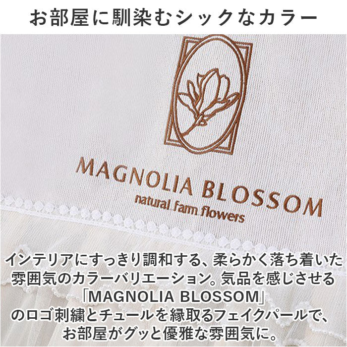 ・インテリアにすっきり調和する、柔らかく落ち着いた雰囲気のカラーバリエーション。気品を感じさせる「MAGNOLIA BLOSSOM」のロゴ刺繍とチュールを縁取るフェイクパールで、お部屋がグッと優雅な雰囲気に。