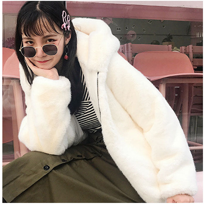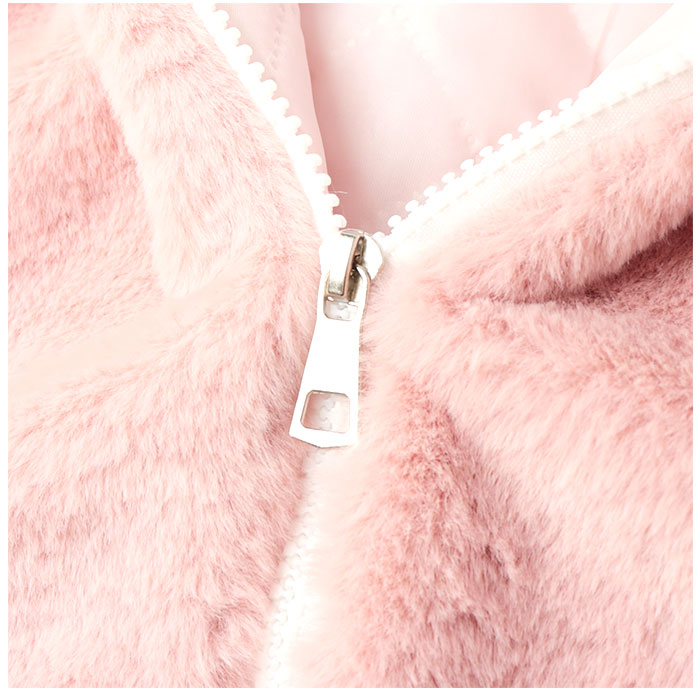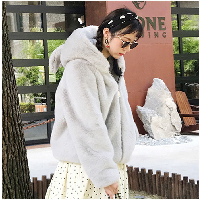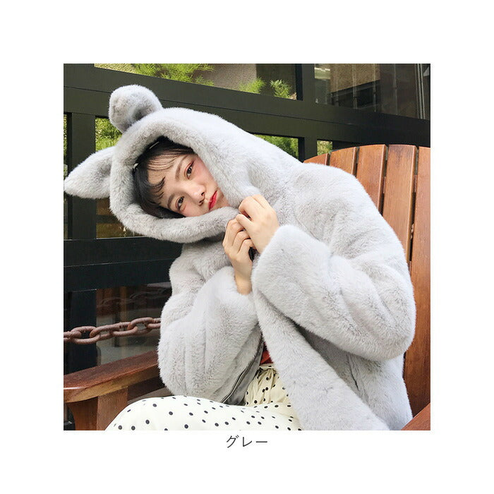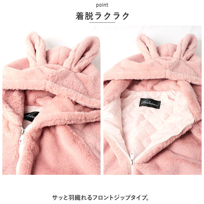 ・かわいいうさ耳が付いたフード。裏地にもファー素材を使用し、かぶれば頭まで温か♪