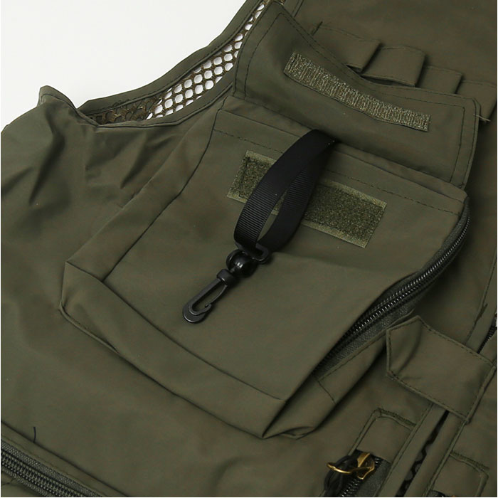 ・フロントの右胸にはループ×4、下のフラップポケットにキーフックを装備。フロント部だけでもファスナーポケット、フラップポケット合わせて12ポケット仕様。