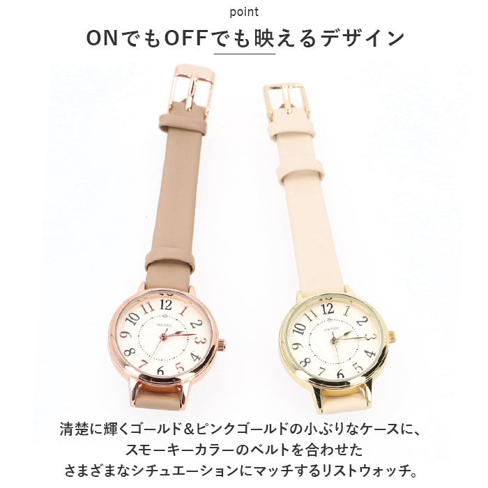 ・清楚に輝くゴールド&ピンクゴールドの小ぶりなケースに、スモーキーカラーのベルトを合わせたさまざまなシチュエーションにマッチするリストウォッチ。
