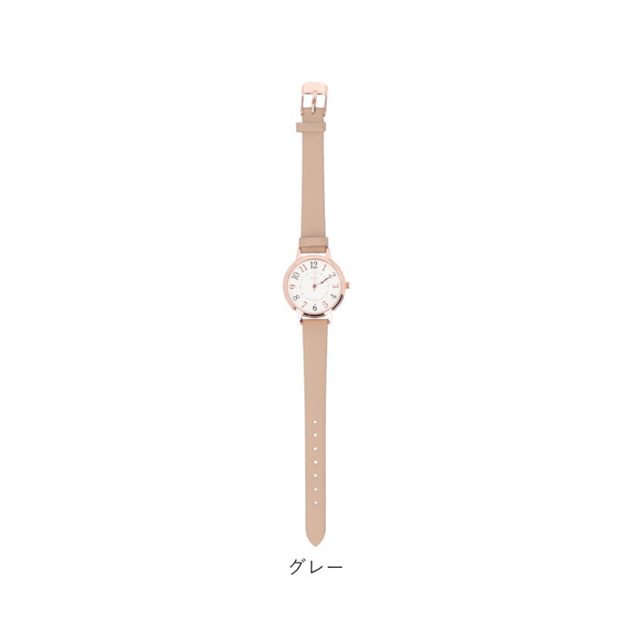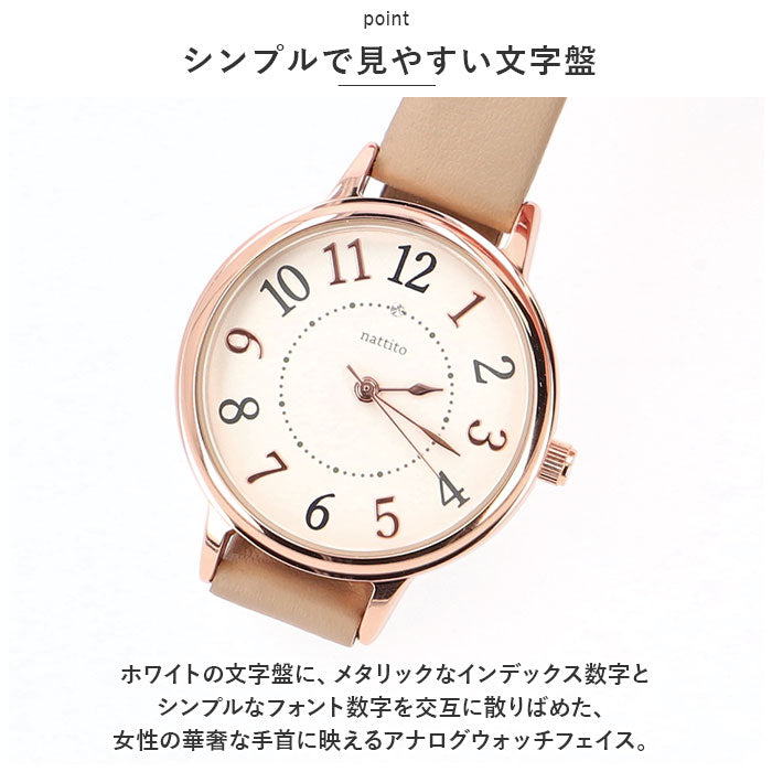 ・ホワイトの文字盤に、メタリックなインデックス数字とシンプルなフォント数字を交互に散りばめた、女性の華奢な手首に映えるアナログウォッチフェイス。