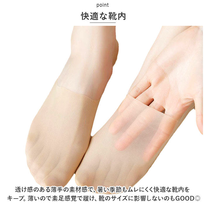 ・透け感のある薄手の素材感で、暑い季節もムレにくく快適な靴内をキープ。薄いので素足感覚で履け、靴のサイズに影響しないのもGOOD◎