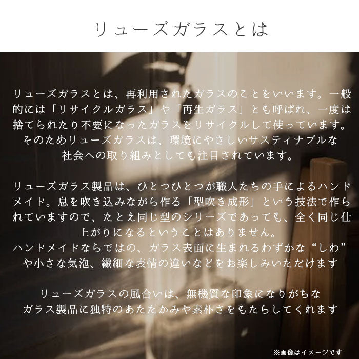 ・リューズガラスとは、再利用されたガラスのこと。”型吹き成形”という技法を用いた職人たちの手によるハンドメイド品で、吹きガラスならではのやや薄く軽い作り。