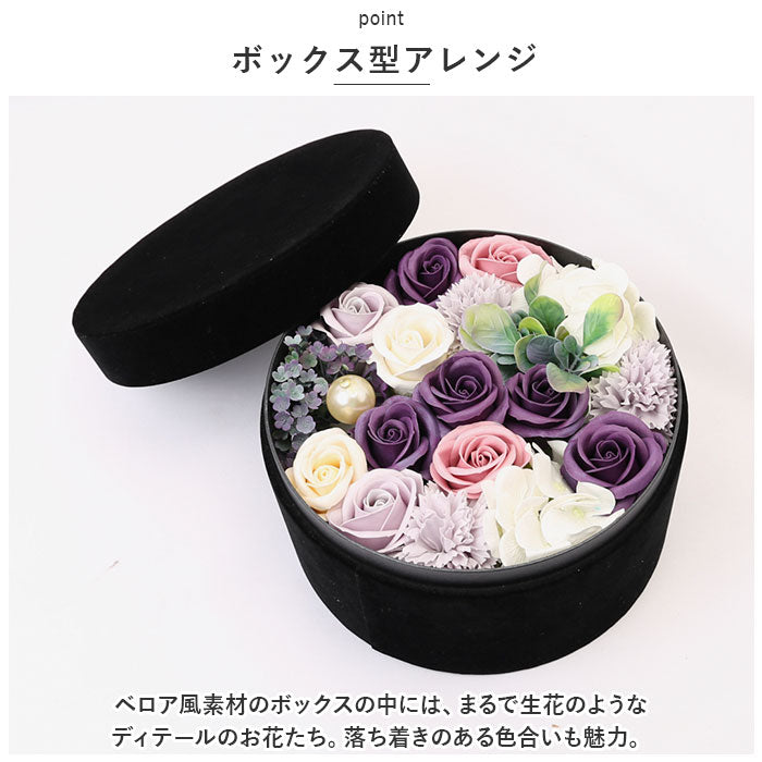 ・ベロア風素材のボックスの中には、まるで生花のようなディテールのお花たち。落ち着きのある色合いも魅力。