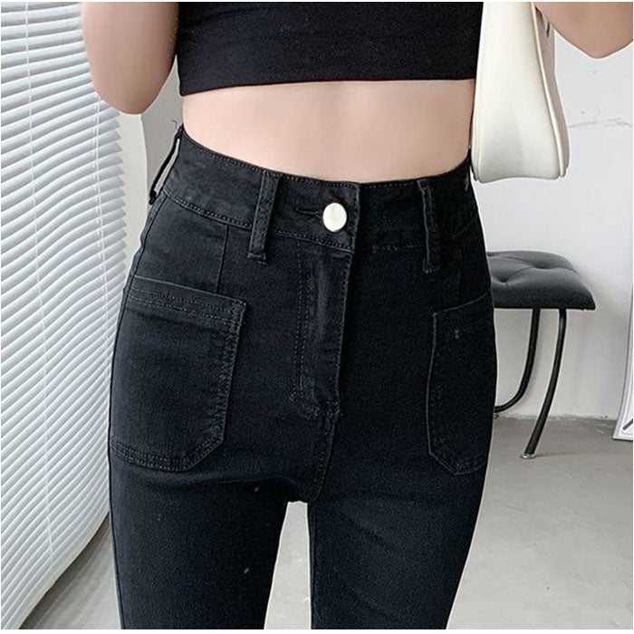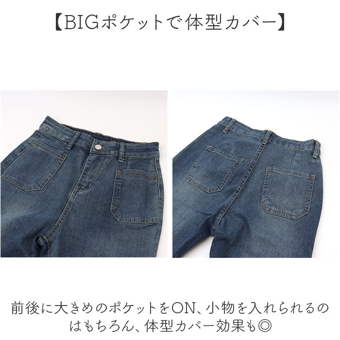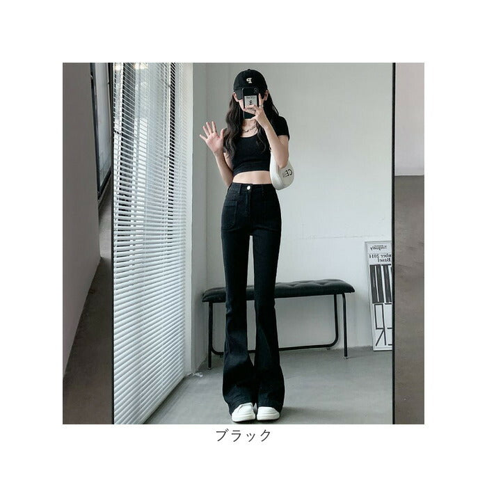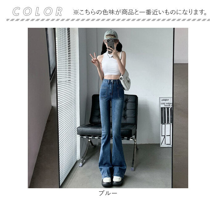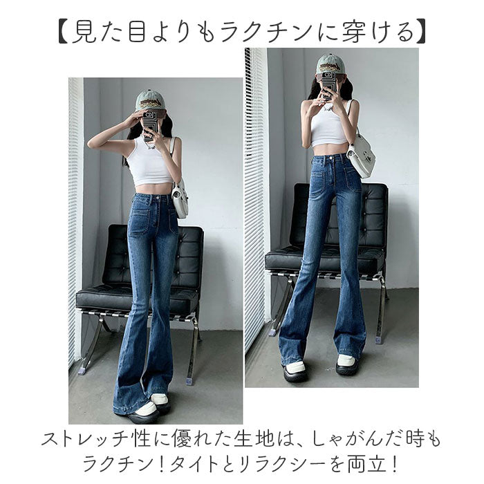 フレアパンツ レディース デニム 通販 デニムパンツ ジーパン ジーンズ ベルボトム ストレッチ 伸縮性 ブーツカット ボタン ファスナー 薄手 ポケット カジュアル ナチュラル きれいめ
