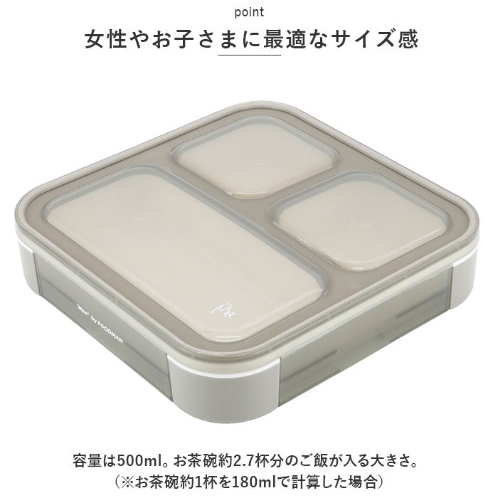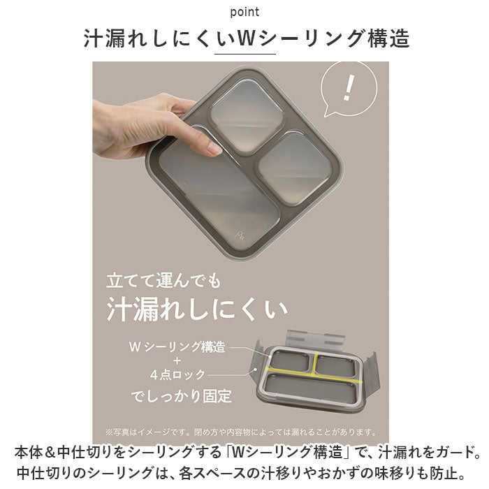 ・本体&中仕切りをシーリングする「Wシーリング構造」で、汁漏れをガード。中仕切りのシーリングは、各スペースの汁移りやおかずの味移りも防止。