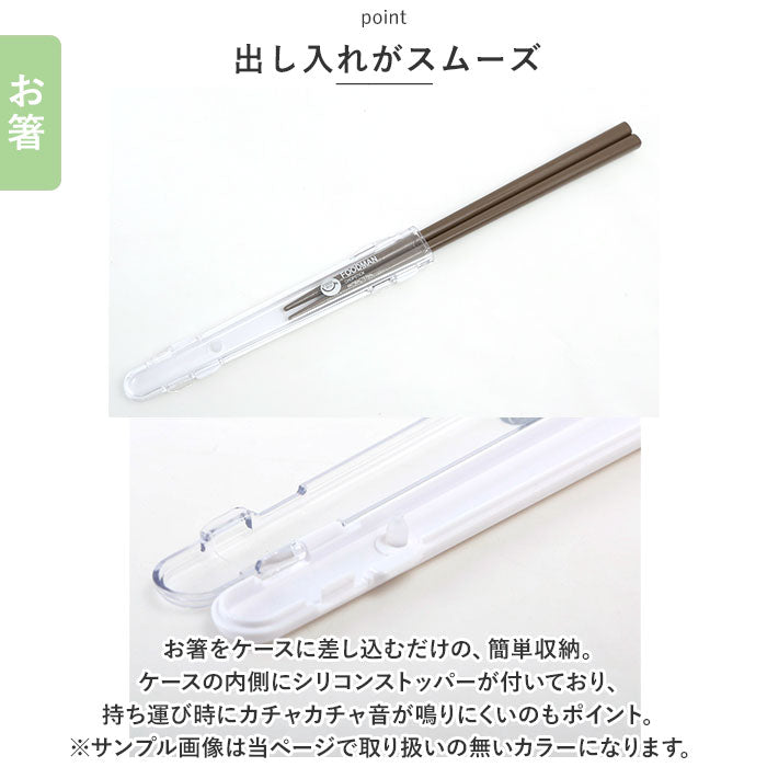 ※お箸をケースに差し込むだけの、簡単収納。ケースの内側にシリコンストッパーが付いており、持ち運び時にカチャカチャ音が鳴りにくいのもポイント。