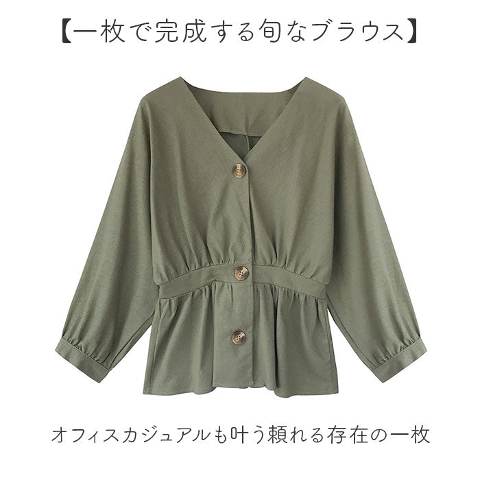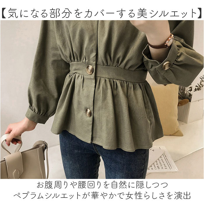 ブラウス レディース おしゃれ 通販 ノーカラーシャツ ウエストギャザー ペプラム シャツ トップス 長袖 きれいめ オフィス オフィスカジュアル 通勤 ビジネス 秋 冬 秋冬 春 春秋