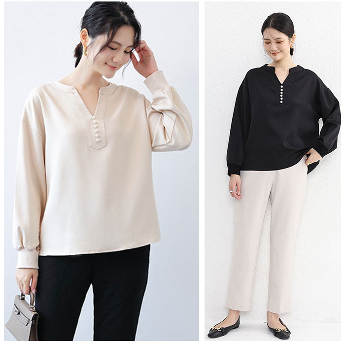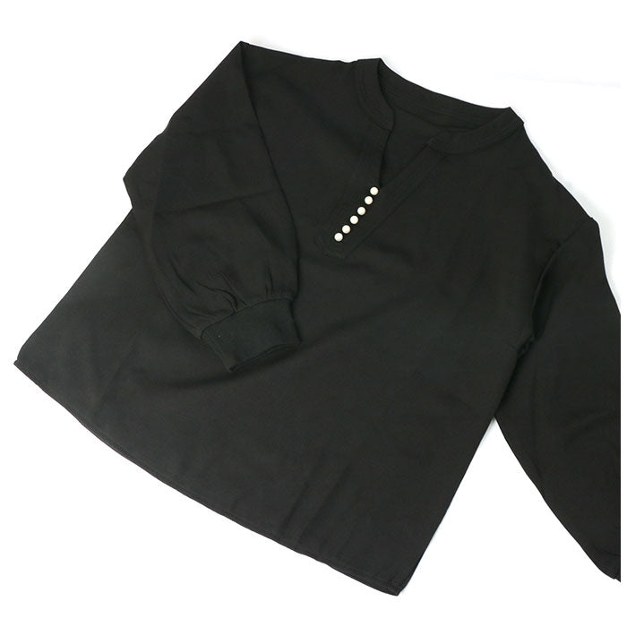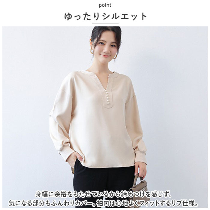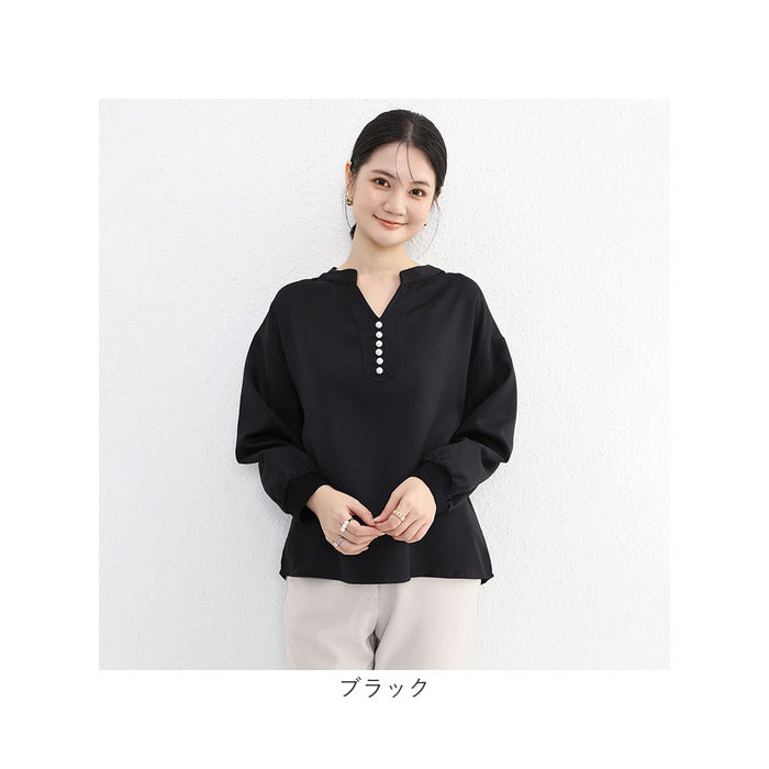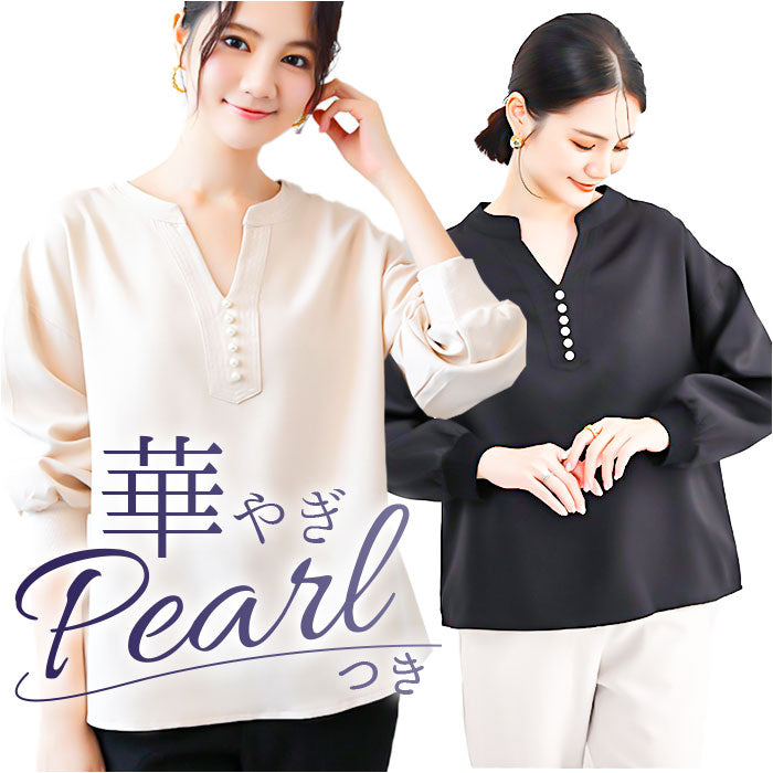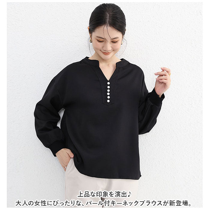 ・上品な印象を演出♪大人の女性にぴったりな、パール付キーネックブラウスが新登場。