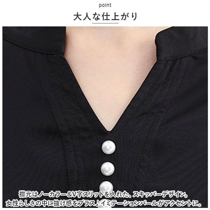 ・襟元はノーカラー&V字スリットを入れた、スキッパーデザイン。女性らしさの中に抜け感をプラス♪イミテーションパールがアクセントに。