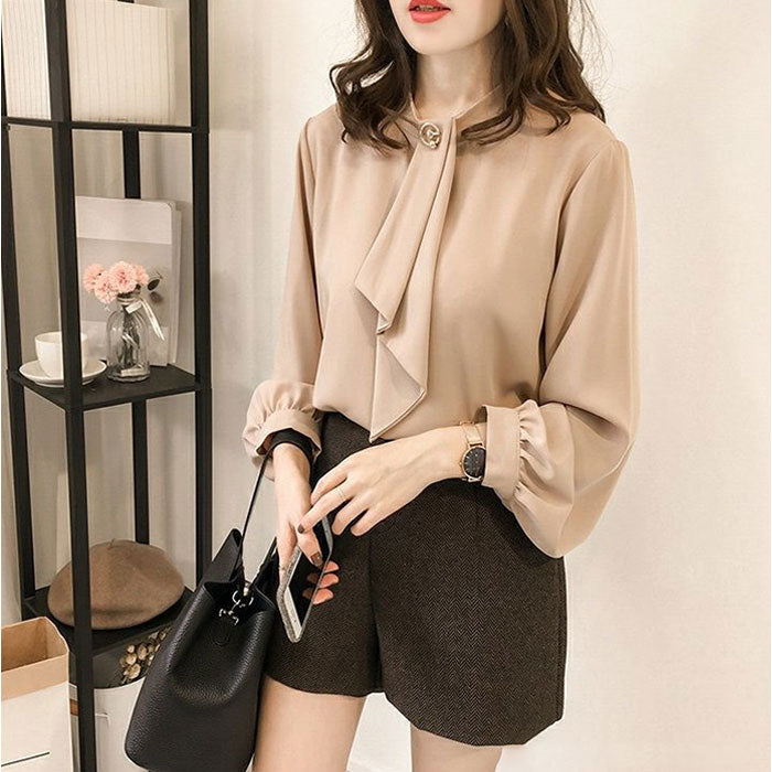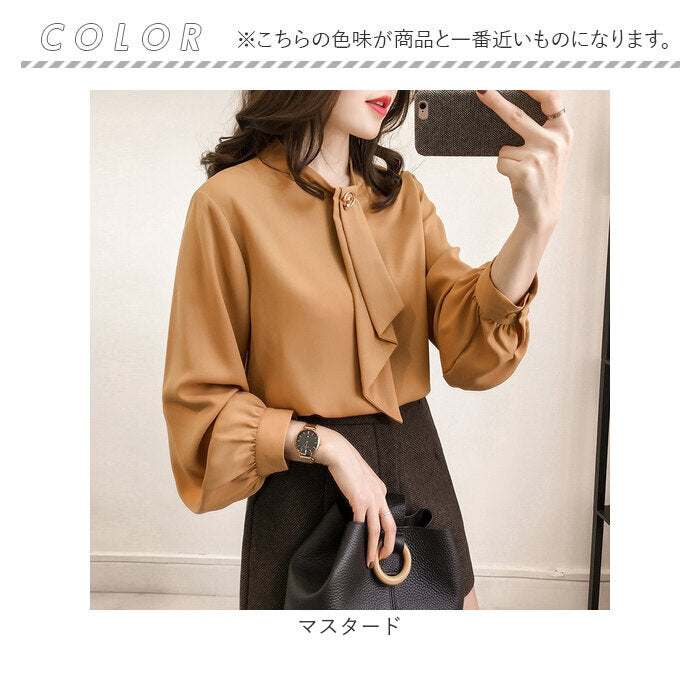 ・ゴールドのアクセントが目を引く「レディース ボウタイブラウス」
