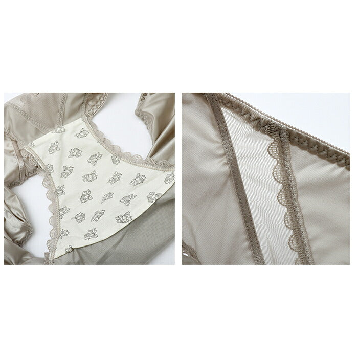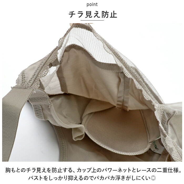 ・胸もとのチラ見えを防止する、カップ上のパワーネットとレースの二重仕様。バストをしっかり抑えるのでパカパカ浮きがしにくい◎