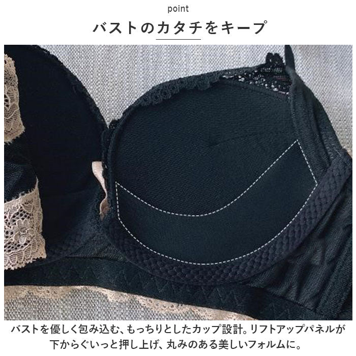 ・バストを優しく包み込む、もっちりとしたカップ設計。リフトアップパネルが下からぐいっと押し上げ、丸みのある美しいフォルムに。