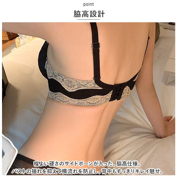 ・程よい硬さのサイドボーンが入った、脇高仕様。バストの揺れを抑えて横流れを防止し、背中もすっきりキレイ魅せ。