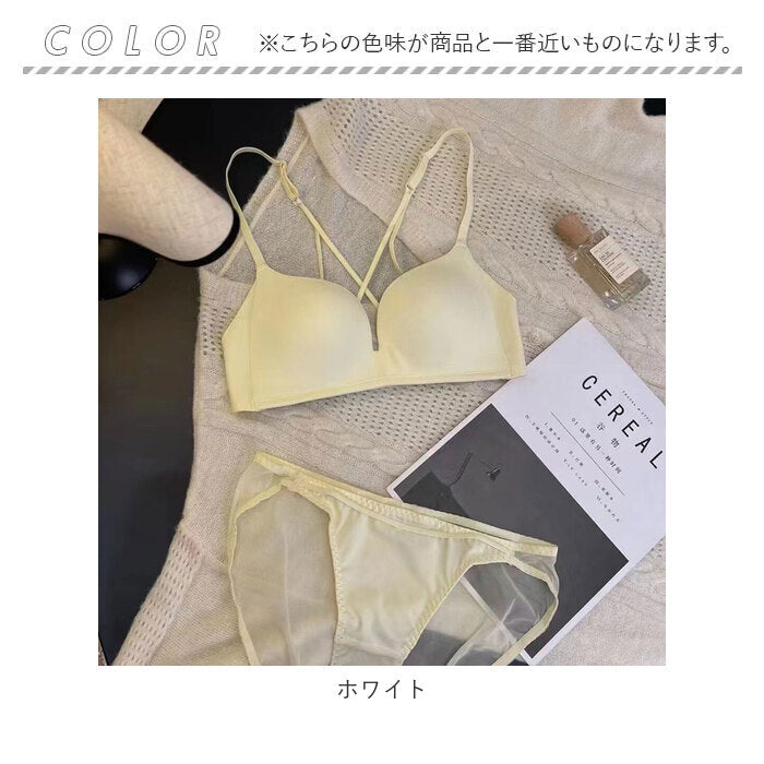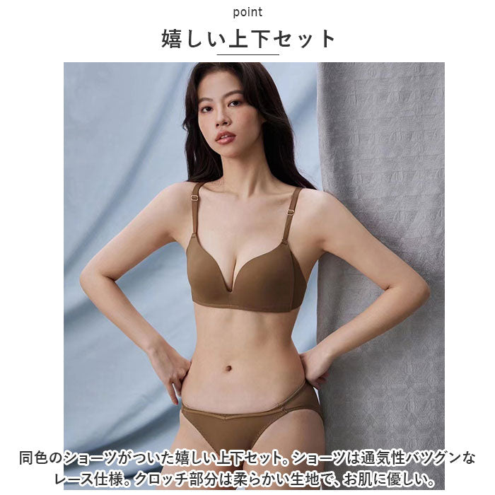 ・同色のショーツがついた嬉しい上下セット。ショーツは通気性バツグンなレース仕様。クロッチ部分は柔らかい生地で、お肌に優しい。
