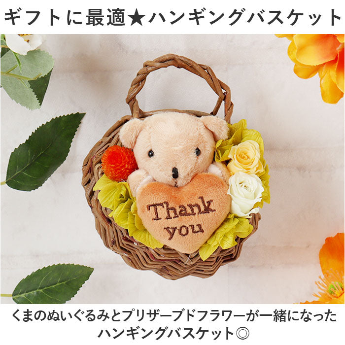 ・くまのぬいぐるみとプリザーブドフラワーが一緒になったハンギングバスケット◎