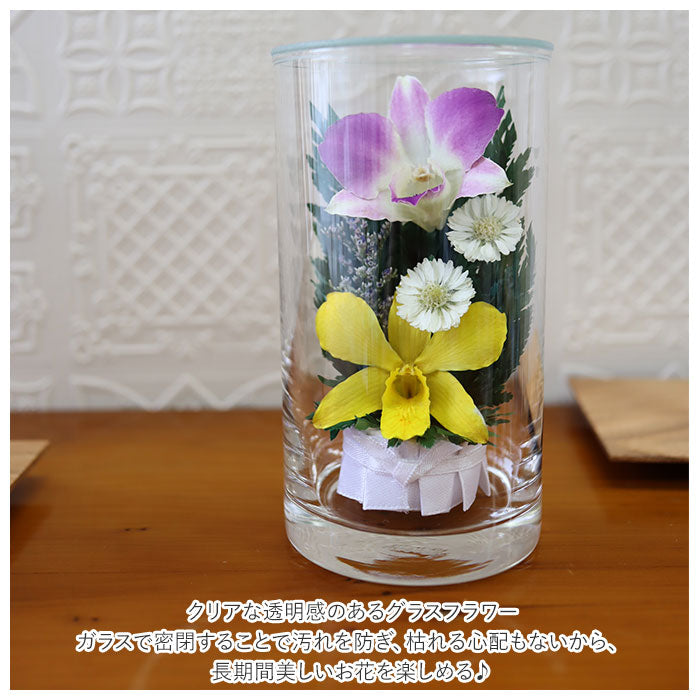 ・クリアな透明感のあるグラスフラワー。ガラスで密閉することで汚れを防ぎ、枯れる心配もないから、長期間美しいお花を楽しめる♪