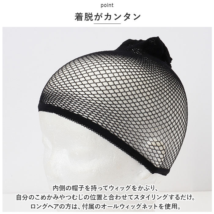 ・内側の帽子を持ってウィッグをかぶり、自分のこめかみやつむじの位置と合わせてスタイリングするだけ。ロングヘアの方は、付属のオールウィッグネットを使用。