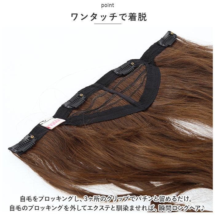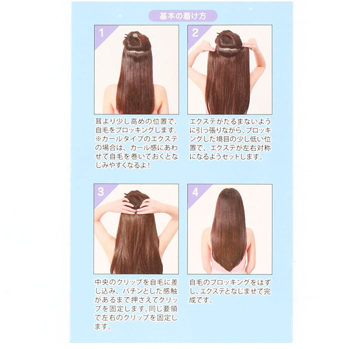 ・自毛をブロッキングし、3ヶ所のクリップでパチンと留めるだけ。自毛のブロッキングを外してエクステと馴染ませれば、瞬間ロングヘア♪