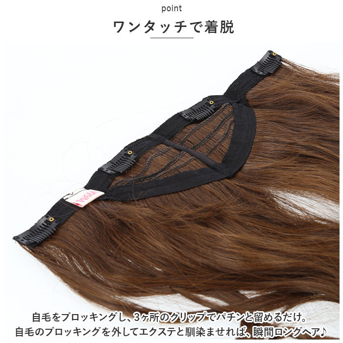 ・自毛をブロッキングし、3ヶ所のクリップでパチンと留めるだけ。自毛のブロッキングを外してエクステと馴染ませれば、瞬間ロングヘア♪