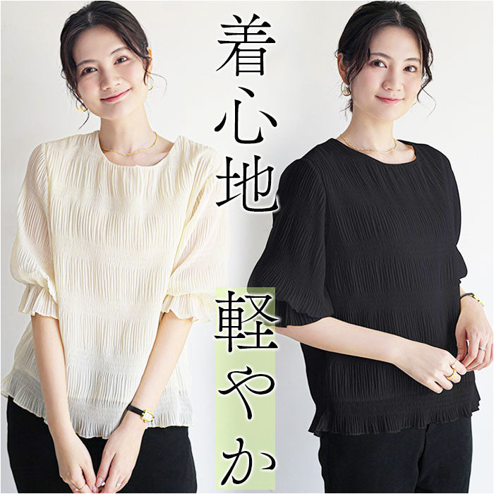 ・袖部分はふわっと丸みのあるフォルムで、気になる二の腕まわりもおしゃれにカバー。袖口にピタッと留まるゴムが入った5分袖タイプ。