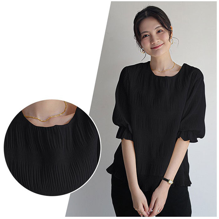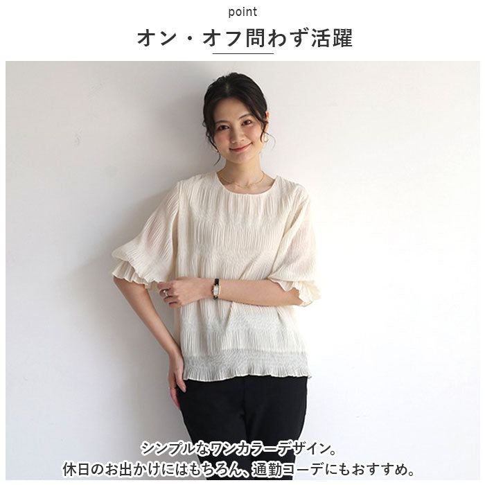 プルオーバー レディース 通販 フリル 5分袖 ブラウス Tシャツ ラウンドネック 丸首 薄手 ゆったり カジュアル ポリエステル おしゃれ アウター 春 夏 トップス