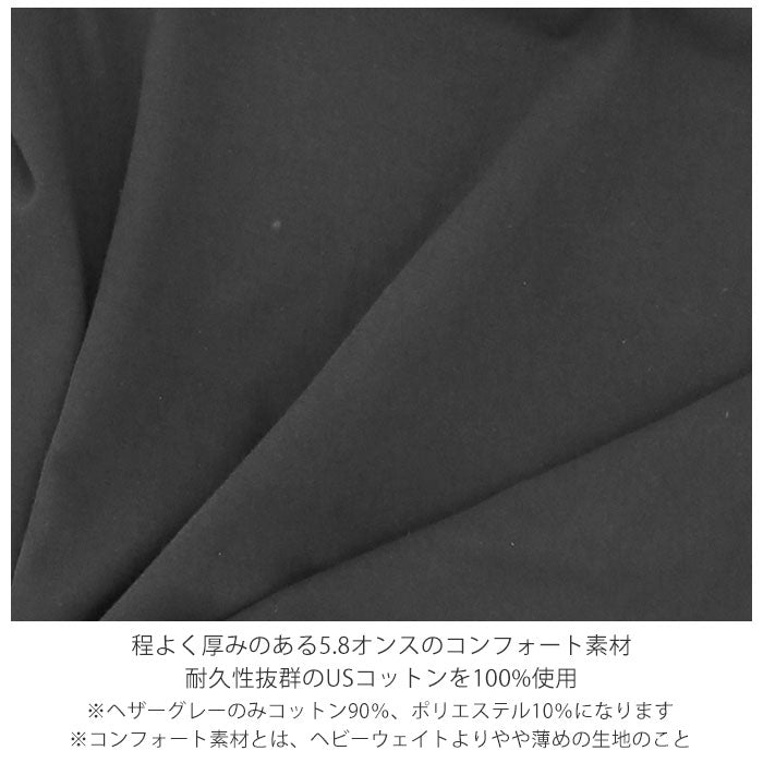 ・程よく厚みのある5.8オンスのコンフォート素材で、耐久性は抜群!USコットンを100%使用した生地なので、通気性がよく快適な着心地。